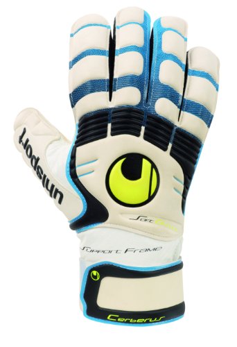 GUANTI DA PORTIERE UHLSPORT CON STECCHE. Nuovo modello realizzato con speciale elemento Supportframe per garantire una maggiore presa. Design Shockzone per garantire maggiore traspirabilit e cinturino in lattice avcvolgente. PALMO: schiuma di lattice antiscivolo. DORSO: lattice. TAGLIO: normale. CARATTERISTICHE TECNICHE (valutazioni UHLSPORT): PRESA IN CODIZIONI ASCIUTTE: 2 PRESA IN CONDIZIONI UMIDE : 2 AMMORTIZZAZIONE : 1 RESISTENZA ABRASIONE : 1